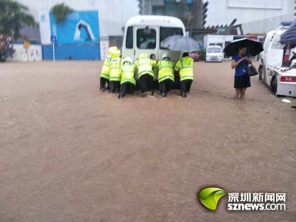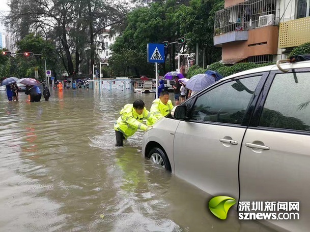 暴雨期间,盐田交警大队及时启动了恶劣天气下道路交通保障应急预案,对易浸水路段和区域加强管理。盐田交警们全员出动,水深处直接背起路人蹚水而过,顶着暴雨将熄火车辆推走,被雨水淋透全身却依旧坚守在指挥交通的岗位,交警“小黄人”成街头醒目的路标,徒手蹚水推车过马路的交警蜀黍一度霸屏网络,成为网红“小黄人”。交警等一线工作人员的坚守和付出,确保了暴雨期间辖区道路安全、有序、畅通。