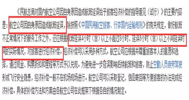 据《民航总局对国内航空公司因自身原因造成航班延误给予旅客经济补偿的指导意见(试行)》规定:航空公司因自身原因造成航班延误,除做好航班不正常情况下的服务工作之外,还应根据航班延误4小时(含)以上不超过8小时、延误8小时(含)以上不同延误时间的实际情况,对旅客进行经济补偿。经济补偿可以采用多种方式。航空公司应根据并尊重旅客本人的意愿和选择,通过现金、购票折扣和里程等方式予以兑现。而根据《航班延误经济补偿指导意见》,天气、机械故障等可以归为航空延误的不可抗力,航空公司无须赔偿旅客任何经济和精神损失。
