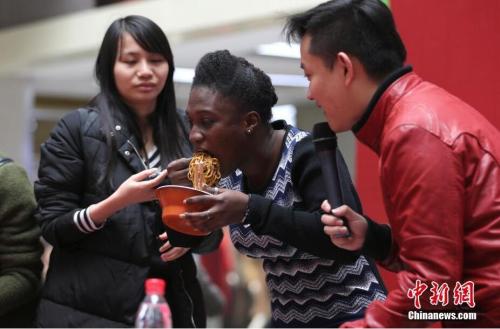 资料图:2016年12月3日,武汉首届“趣味吉尼斯挑战大胃王”国际邀请赛,以吃热干面为主题,在武汉市汉举行,吸引了50位在武汉外国人参赛。 图片来源:CNSPHOTO