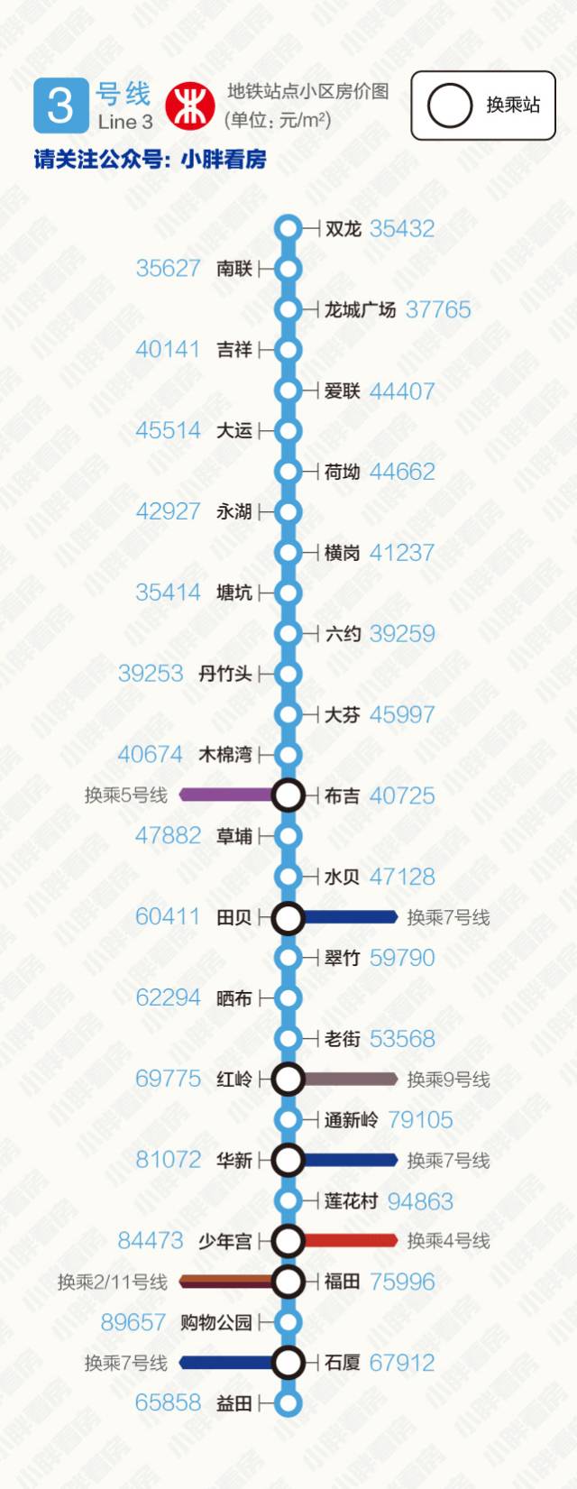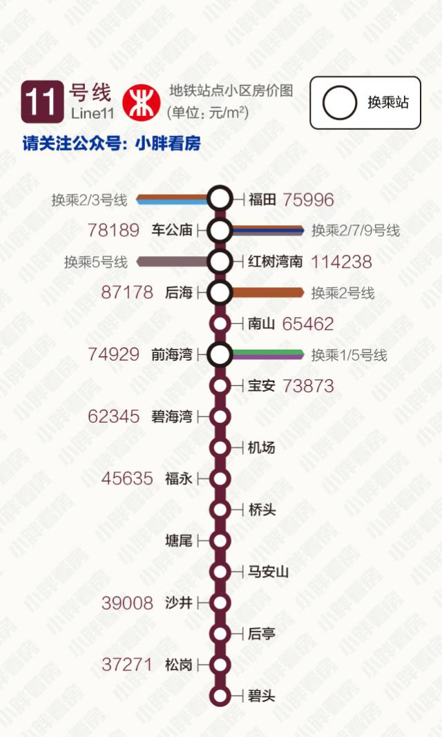 11号线福田到宝安,有3站都能换乘“土豪”2号线,房价较高;11号线后半段沿线房产集中在福永和松岗,价格低位,可迅速占位。