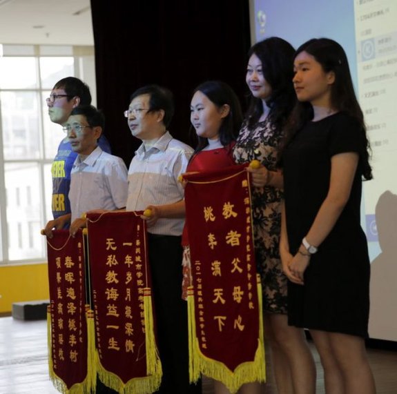 △图为经过复读后考上理想高校的学生代表向教师赠送锦旗。