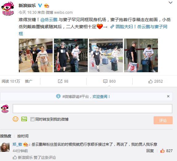 岳云鹏老婆霸气回应独推行李照:我的男人我愿意