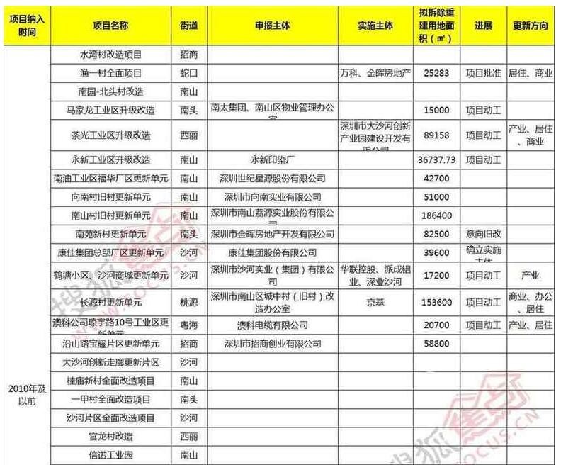 2010年以前,南山城市更新项目主要集中在旧村以及旧工业区改造上,这个阶段的改造主要集中在蛇口片区。