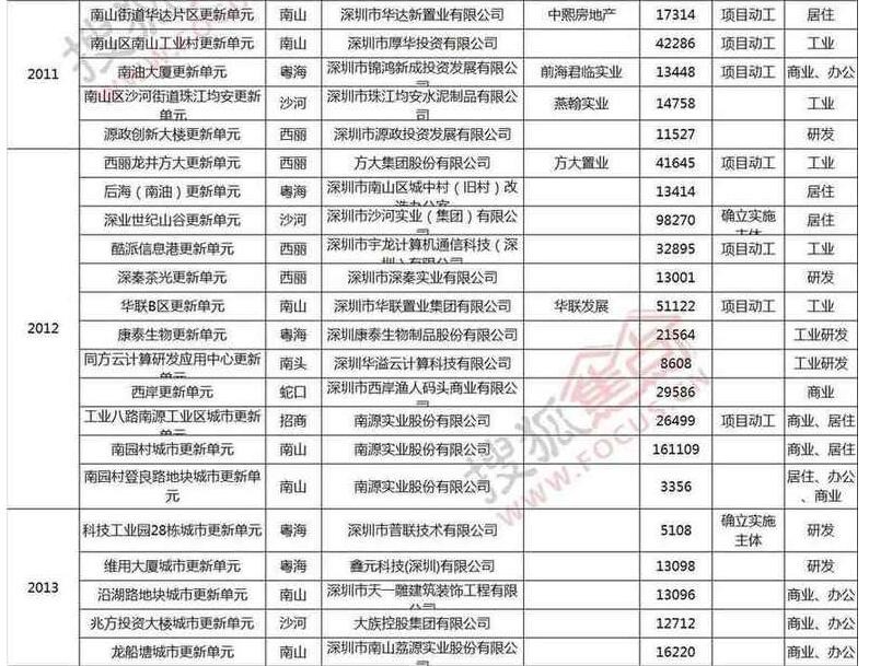 2011-2013年,西丽片区的旧改项目增加,改造方向偏向工业及研发,这三年获批的22个项目里就有11个是工业、研发类项目,含居住功能的项目有6个,其余为商业、办公类项目。