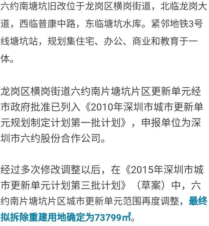 目前地块处于意愿更新状态,并未正式纳入城市更新计划当中。而现阶段整个横岗片区已纳入城市更新计划当中的旧改项目多达19个,而拆除重建范围面积超过20万平方米的有六个,其中包括有排榜村旧改(65万平)、贤和旧村旧改(50万平)、新坡塘片区及新园路石化塑胶城旧改(24万平)等。
