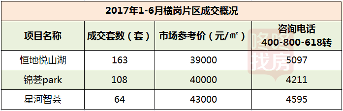 横岗今年上半年楼市表现保持稳定,片区内共有3个项目成交,其中恒地悦山湖贡献量最大,整体成交均价4.5万/平左右。