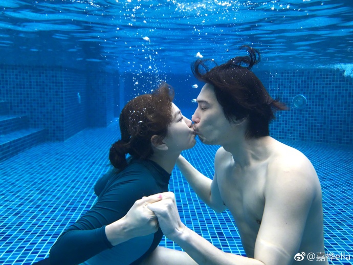 7月24日,Ella微博晒出一组一家三口泳池玩水照片,照片中的Ella与老公甜蜜水下亲吻大秀恩爱,可爱的儿子劲宝游泳也要很时尚,戴着墨镜套着泳圈,嘴角微翘非常惬意。