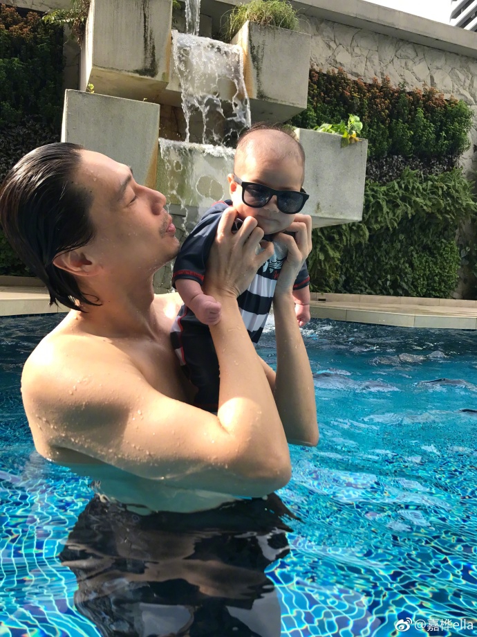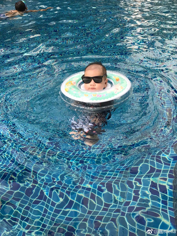 7月24日,Ella微博晒出一组一家三口泳池玩水照片,照片中的Ella与老公甜蜜水下亲吻大秀恩爱,可爱的儿子劲宝游泳也要很时尚,戴着墨镜套着泳圈,嘴角微翘非常惬意。