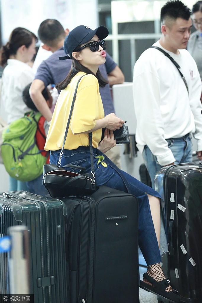 7月24日,宋茜现身机场,身穿开叉裤配渔网袜,与工作人员说笑心情好,坐箱子上嘟嘴卖萌,少女感十足。视觉中国/图