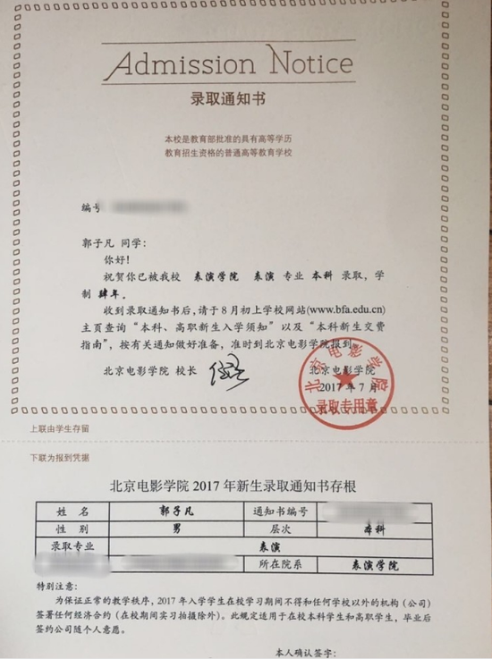 近日,王俊凯如愿以偿被北京电影学院录取,今年与他同被北电录取的还有X玖少年团的郭子凡。X玖少年团官方微博晒出郭子凡收到的北电录取通知书,在这纸通知书的下面有一项“特别注意”引起热议。