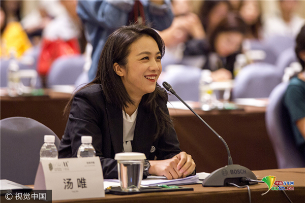 7月25日,第十一届FIRST中国西宁青年电影展创投会在西宁举行,著名影星汤唯和著名电影人施南生、曹保平作为本次创投会的评委出席了评审会。本届影展一共有12部片子入围创投会,现场青年导演一边为自己的片子宣讲一边聆听评委的精彩点评,受益匪浅。汤唯身穿黑色西装亮相,不时托腮展露灿烂笑容,优雅大气。