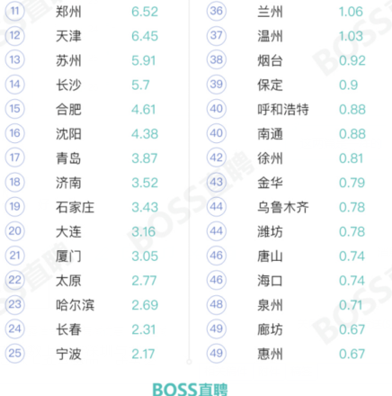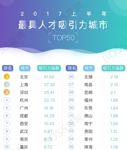 结合上述两份榜单以及近年来的一些数据观察,BOSS直聘分析,“北上广深”不再如之前那么耀眼,它们对于应届生的吸引力正在下滑。其数据显示,2017年上半年,北上广深人才流失率达到0.51%,较2016年增加近0.3个百分点。虽然,一线城市为人才提供更多的就业机会和广阔的发展空间,但高房价、出行压力等日益严重的社会问题正降低求职者的就业热情。