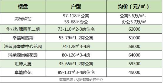 另外需要说明的是,这里的龙华片区指的是龙华区除观澜、大浪、民治以外的区域。目前片区内在售的新盘不多,住宅只有三个(其中两个是鸿荣源的),整体价格在5-6.5万/平之间。(以下表格均为在售新房价格,与前面二手房价涨跌幅排行榜无关)