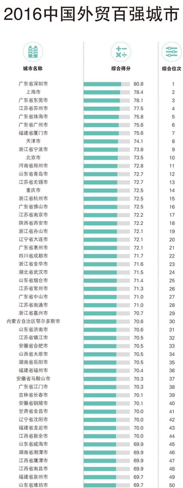 ④ 海关总署公布2016中国外贸百强城市:深圳第一
