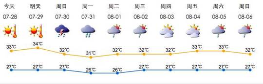 我市多云,有短时阵雨或雷阵雨,天气炎热到酷热;气温27-33℃;东风2级;相对湿度70%-90%,中午前后天气炎热,注意防暑降温。