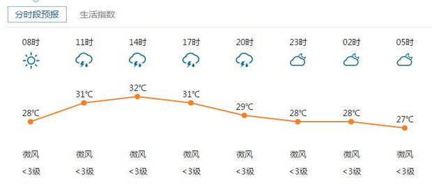 【深圳天气趋势】预计28-29日晴天到多云为主,部分时间有短时阵雨,天气炎热到酷热;30-31日降雨渐趋明显,有一次降水过程,高温炎热缓解;展望8月1日降雨减弱,天气再趋炎热。 今年第9号台风“纳沙”27日11时加强为强热带风暴,28日05时位于吕宋岛以东的西北太平洋,深圳东南方约1250公里,中心附近最大风力11级(30米/秒)。预计“纳沙”将以15公里左右的时速向北偏西方向移动,强度逐渐加强,并向台湾东南部沿海靠近,未来三天对我市无直接影响。