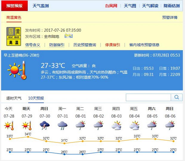 【上班天气】天气炎热,注意防晒#预计早晨7-9时,全市多云为主;气温27-30℃;吹微弱的东北风;相对湿度75%-90%;全市大部分地区能见度在10公里以上,中午前后天气炎热,注意防暑降温,局地有阵雨或雷阵雨,出门请带伞。