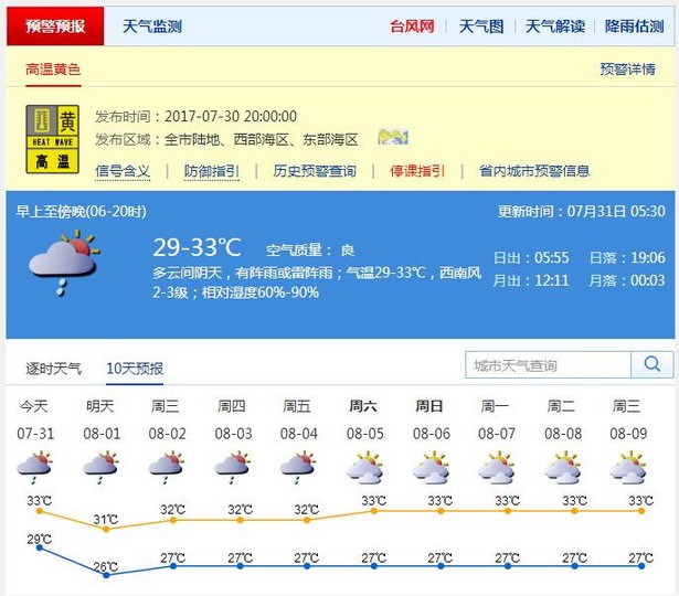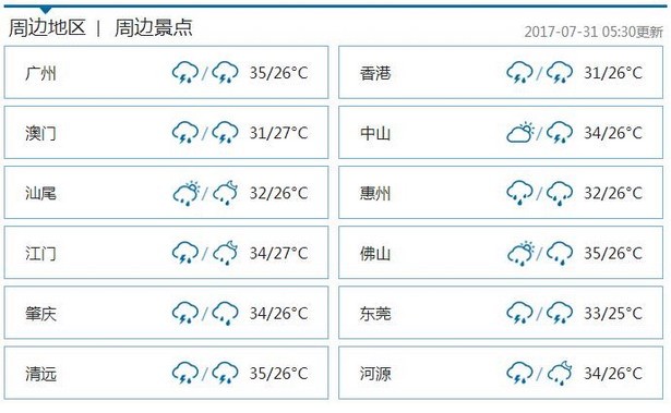 预计31日多云到阴天,局部地区有雷阵雨,气温28-33℃。8月1-4日多云为主,间中有阵雨或雷雨。5-7日多云局部有短时雷阵雨。天气酷热,市民需注意做好防暑降温工作。