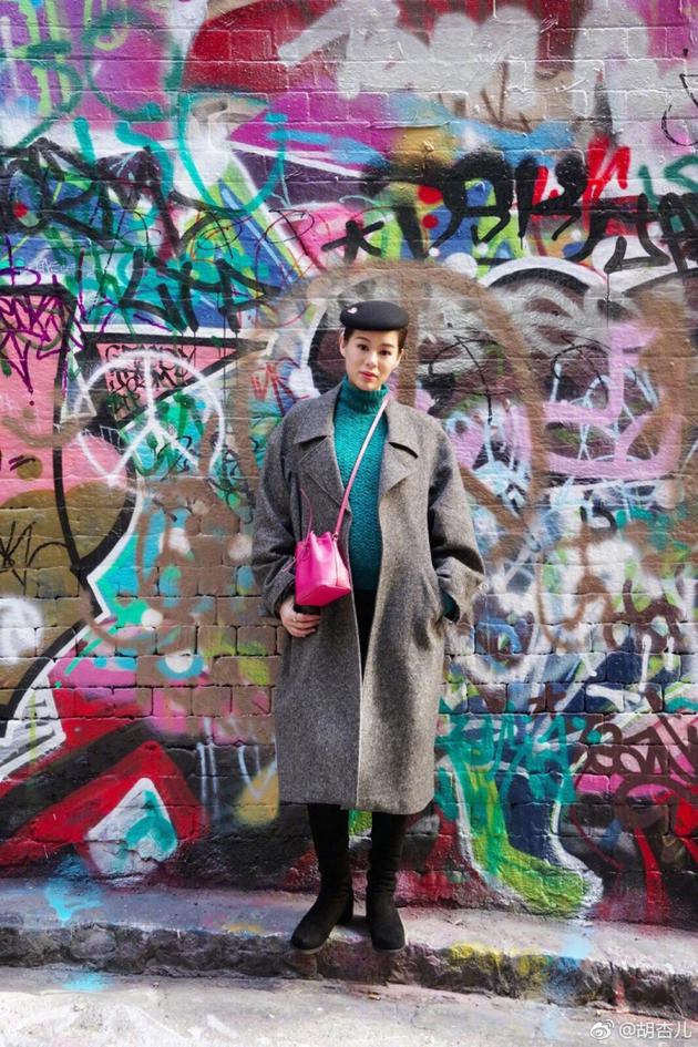 7月31日,胡杏儿晒出一张定位澳大利亚的美照,照片中的胡杏儿孕肚已经非常明显,她身穿长款大衣,绿色的毛衣和粉色的包包形成撞色,呼应着她身后色彩丰富的涂鸦墙。