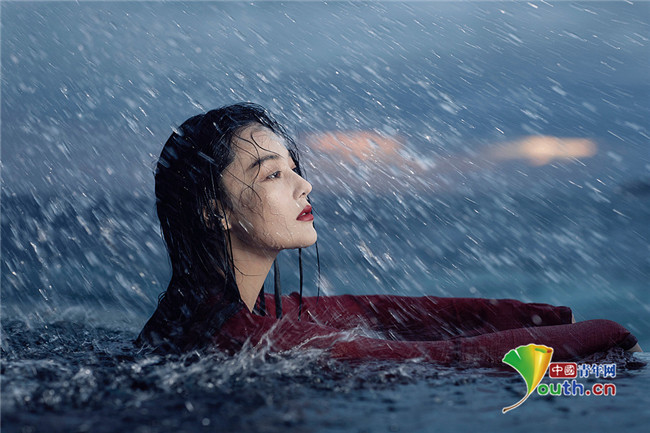 张馨予身着一件简单暗红中国风长裙水中拍写真魅惑十足,烈焰红唇显示清冷美艳气质,身体轻盈与墨蓝大海融为一体,或清丽如仙,或妖娆冷冽,黑色长发更增魅惑,张馨予将妖、仙两种气质诡异结合。