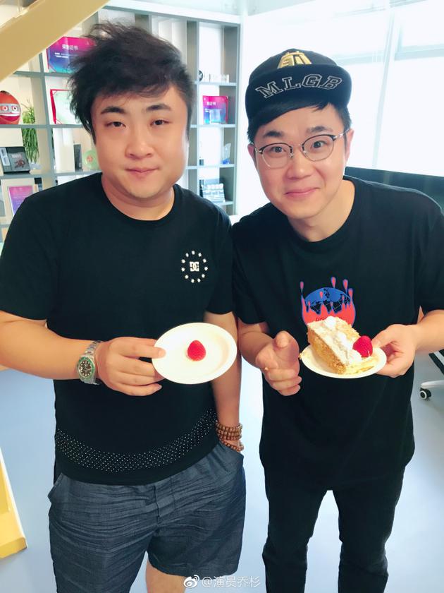 8月2号晚,演员乔杉发微博晒照“感谢”大鹏董成鹏的“盛情款待”:“来大鹏工作室做客,他说请我吃蛋糕,真讲究!”这段文字和所配图片形成了强烈的反差,只见照片中乔杉和大鹏并排站在工作室,两人手中均端着一个蛋糕碟,大鹏的碟子里盛着整块的草莓蛋糕,而乔杉的碟子里就只装着一颗草莓。乔杉一脸生无可恋,配合着大鹏帽子上的“MLGB”让人忍俊不禁。