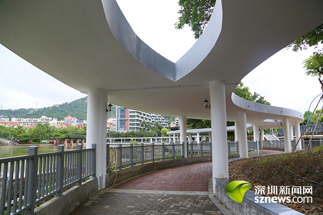 在现场,记者看到,长1173米的风雨连廊,沿愿望湖而建,北侧接大梅沙京基海湾大酒店,南侧近雅兰酒店,地面由彩色沥青铺装而成,一侧设有大理石座椅,长廊边上有冠大荫浓的榕树,长廊顶端还栽种了许多小花,点缀在青山绿水间,形成了优美舒适的海滨旅游环境。