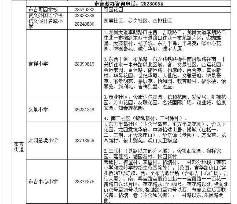 | 大学区试点小一招生区域 | 福龙大道以东、向荣路以南、佳民路以东、布龙路以南、民治大道以西、民安路以北、通菜街以西、民福路以西、民兴街以北、梅龙路以西及平南铁路以北的范围 | |