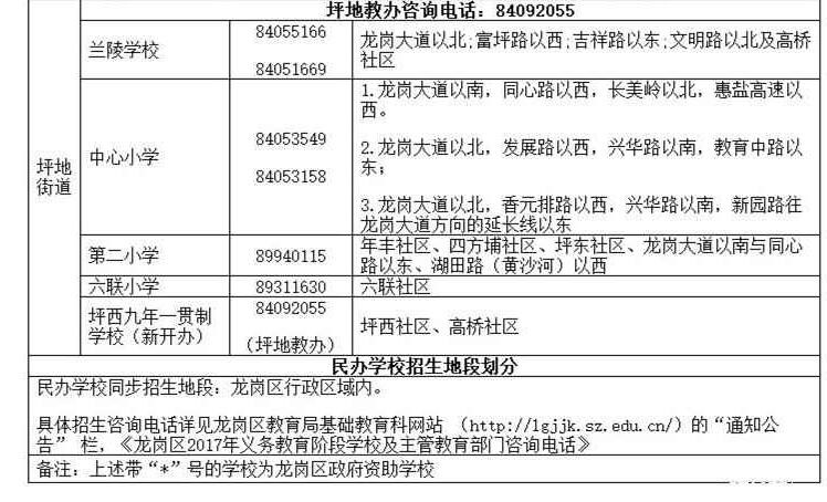 | 民治中学 | 人民路以东、民塘路以东、民兴街以北、梅龙路以东、平南铁路以北范围,含风和日丽、日出印象、公馆1866、潜龙景园、梅花山庄、华美丽苑等小区 | 81786611 |