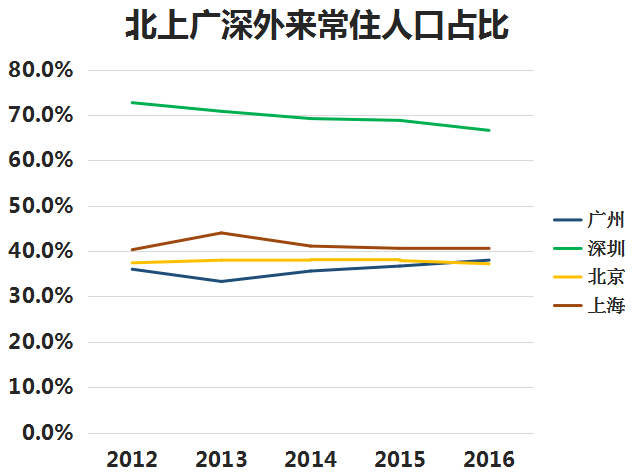 2010年前后,由于外来人口的大量涌入,而且很多人来了就留下了,就此奠定了许多城市人口结构。以一线城市为例,2012年北上广深外来人口占比分别是37.4%、40.3%、36%、72.7%。