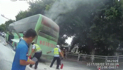 8月2日下午16时40分,一辆从湛江开往深圳的长途大巴,因电线短路,油管被烧断,导致了大巴尾部起火。当时,正在西乡大道与前进路交汇处固定岗执勤的民警黄树波很快就发现了对面马路出现异常!