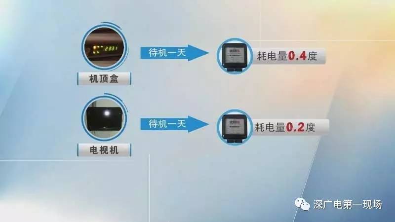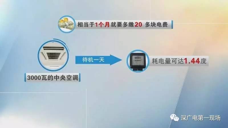 据测算,小小的机顶盒,待机一天耗电量就高达0.4度,电视机待机一天耗电0.2度,若使用额定功率为3000瓦的中央空调,在不制冷、不拔插座的情况下,待机一天的耗电量可达1.44度,相当于1个月就要多缴20多块电费。