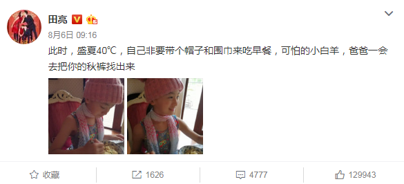 8月6日,田亮在微博晒出女儿森碟照片。并且配文称:“此时,盛夏40℃,自己非要带个帽子和围巾来吃早餐,可怕的小白羊,爸爸一会去把你的秋裤找出来。”