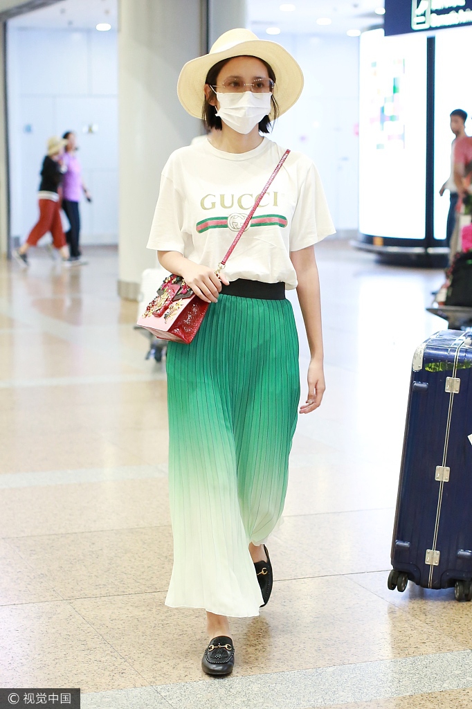 2017年8月6日讯,北京,唐艺昕公布恋情后回京,但因飞机延误一晚疲惫到不行。她身穿渐变色长裙玩小清新很抢眼。视觉中国/图文