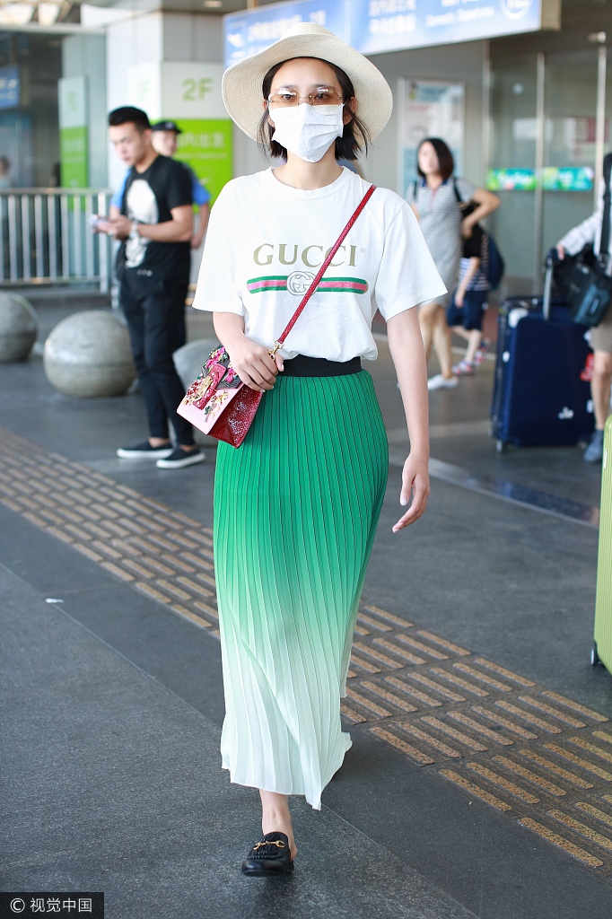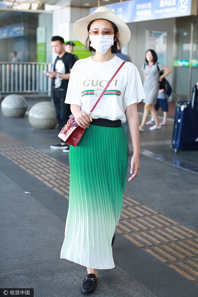 2017年8月6日讯,北京,唐艺昕公布恋情后回京,但因飞机延误一晚疲惫到不行。她身穿渐变色长裙玩小清新很抢眼。视觉中国/图文
