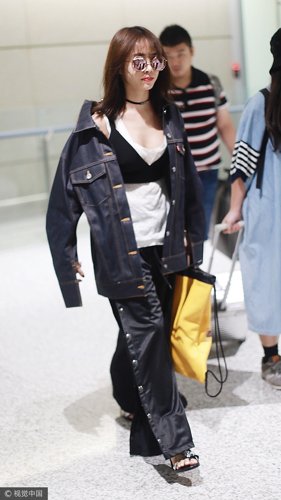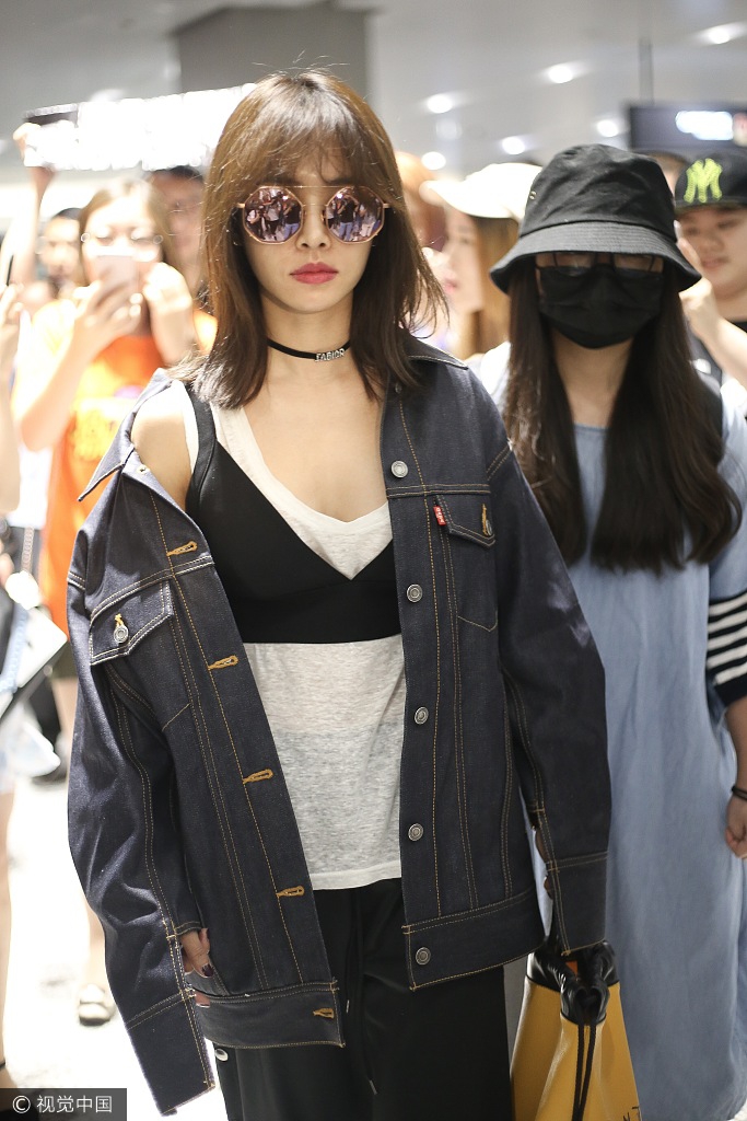 2017年8月7日讯,上海,蔡依林现身机场,留空气刘海架潮镜,内衣外穿秀美胸雪肤,半穿上衣又酷又美。视觉中国/图文