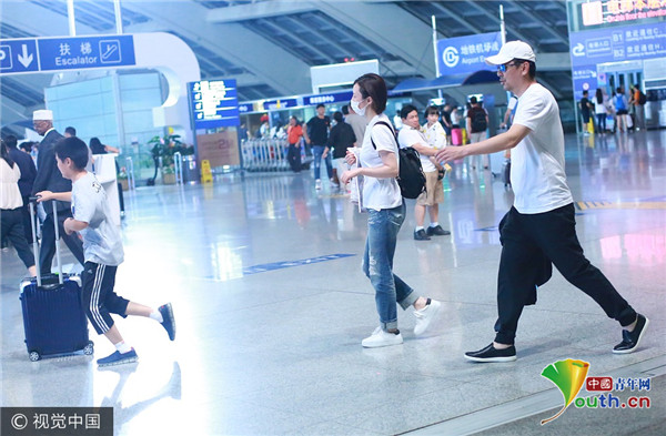 蒋勤勤陈建斌一家出行 儿子自推行李一马当先