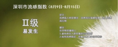 8月8日,深圳市疾控中心公布了8月9日-15日的深圳市流感指数,从连续三周的Ⅰ级(极易发生),下降为Ⅱ级(易发生)。