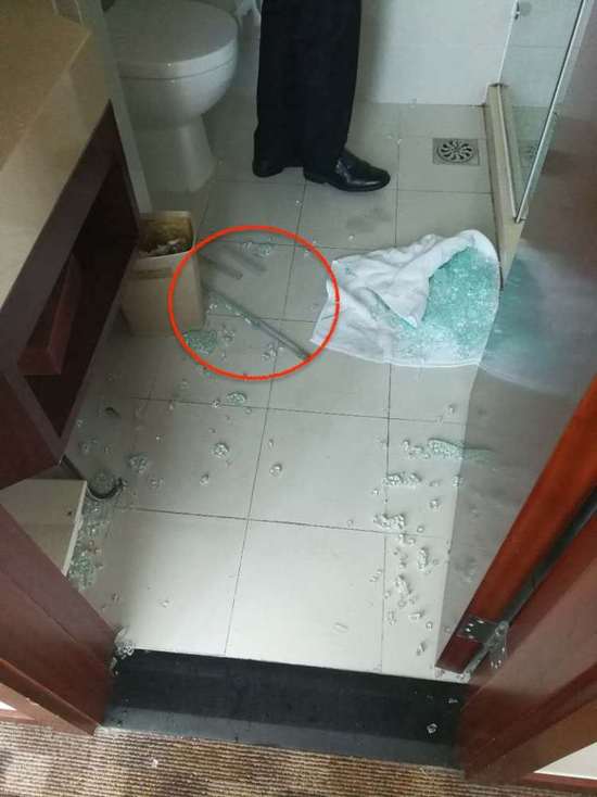 然而,对于酒店的这一说法,英英妈妈表示很难认同。她同样向周到君出示了一张照片,照片显示,大量玻璃碎块落在了淋浴室内部,只有少量落在了外面:“如果是向外推,这些玻璃应该主要落在淋浴室外。”