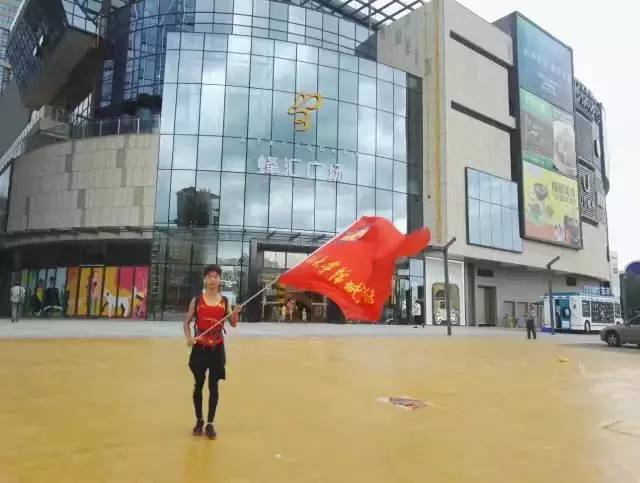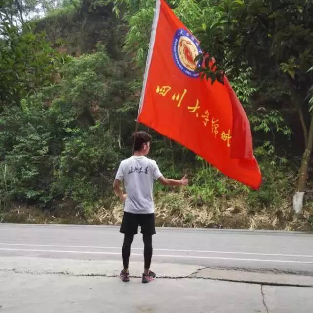 在廖兴前期的规划中,此次行程全部跑国道,一天跑70公里左右,到深圳约40天时间。“结果我一天太兴奋了,从早上开始一直在跑,大中午都没有休息,下午5点过跑多了简阳,都八九十公里了。”廖兴说。也就是从简阳开始,廖兴把校旗从背包里拿了出来,用一根杆子扛着校旗跑。“一路背着校旗,也是对我们母校的一个宣传”。