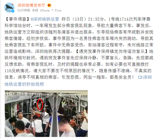 深圳新闻网讯 (记者 黄淳)据深圳微博发布厅消息,昨日(13日)21:32分,深圳地铁1号线1714次列车停靠科学馆站台时,一车厢发生部分乘客慌乱现象,导致大量乘客下车。