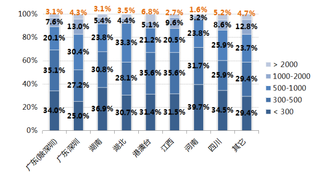 低价位方面,广东省内(除深圳)、湖南、江西和河南籍的客户更能接受总价在500万以下的物业,比例在65%至70%之间,前三依次为河南的71.4%、广东省的69.1%、和湖南的67.7%。其中,购买总价在300万以下的客户籍贯占各自总体的比例,从高到低高过全国平均水平的主要有河南、湖南、四川和广东(除深圳),依次为39.7%、36.9%、34.5%和34.0%。