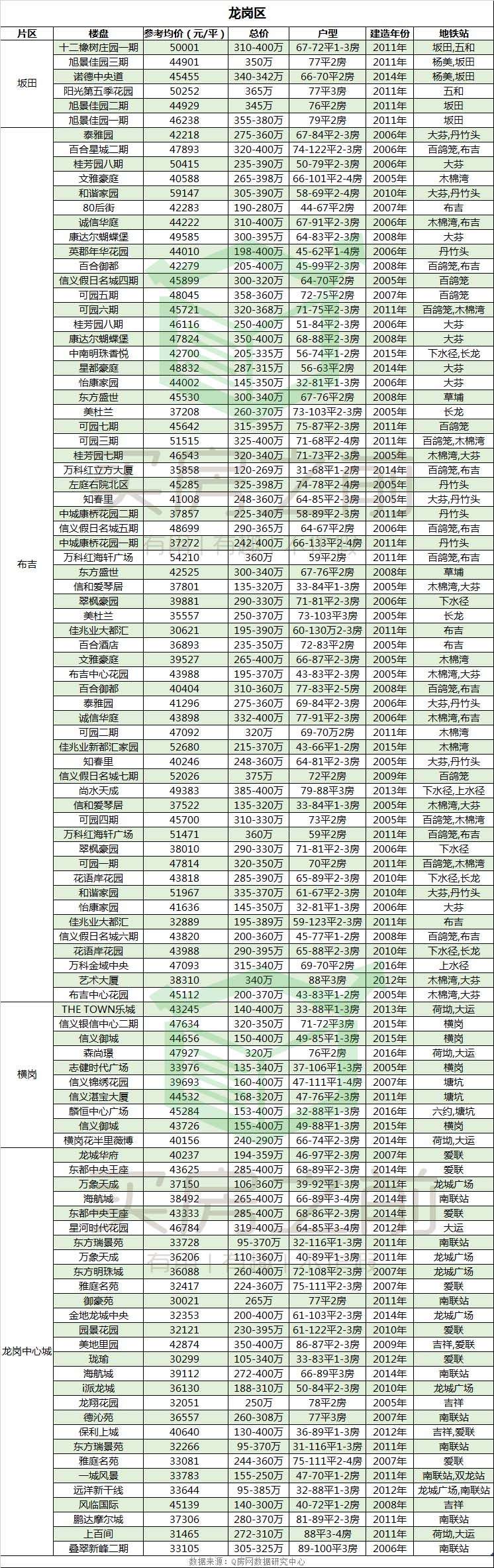 再来看看龙岗区,简直就是地铁刚需盘专业户啊,足足有104个,占据了大半壁江山。绝大部分均价还是3、4字开头,楼盘最多的还属布吉和龙岗中心城。