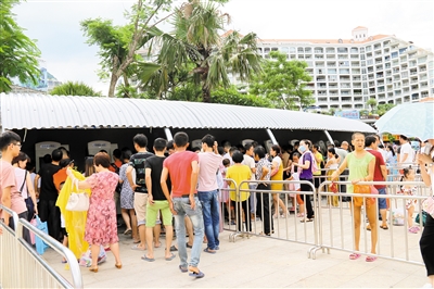 “我从光明坐了两个多小时的车过来,没提前预约,一下车就开始排队,十台机有一半是瘫痪的,人太多我已经等了半个多小时了。”8月9日下午4时许,记者在月亮广场看到,十台售取票机有5台无法使用。从光明过来的游客王先生已经等得有些不耐烦,他和家人分散在不同的队伍中排队。王先生告诉记者,不知道为何,有些人在取票的时候操作要五六分钟,非常慢,而且队伍很没有秩序,场面混乱,一台机前经常有一堆人围着,很嘈杂,看着就心烦,现场也没有人疏导。在太阳广场,记者看到,十台机器完全无法使用,广场保安告诉记者,机器从昨日开始就不能用了,具体原因也不清楚。而广场上的客服中心咨询室前,六条用铁栅栏围起的通道排满队伍,大家在三个窗口前排队取票,但游客排队和疏散都在一个通道内,队伍显得拥挤,秩序甚差。“拿身份证就可以换一张票,不用预约。”有游客表示。对于预约多人的,游客则需出示短信信息给客服看,才能拿到对应的二维码门票。