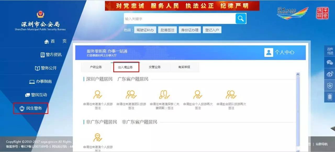 “深圳市公安局”主页/左侧“民生警务”/“出入境业务”,选择您需要申请的业务。