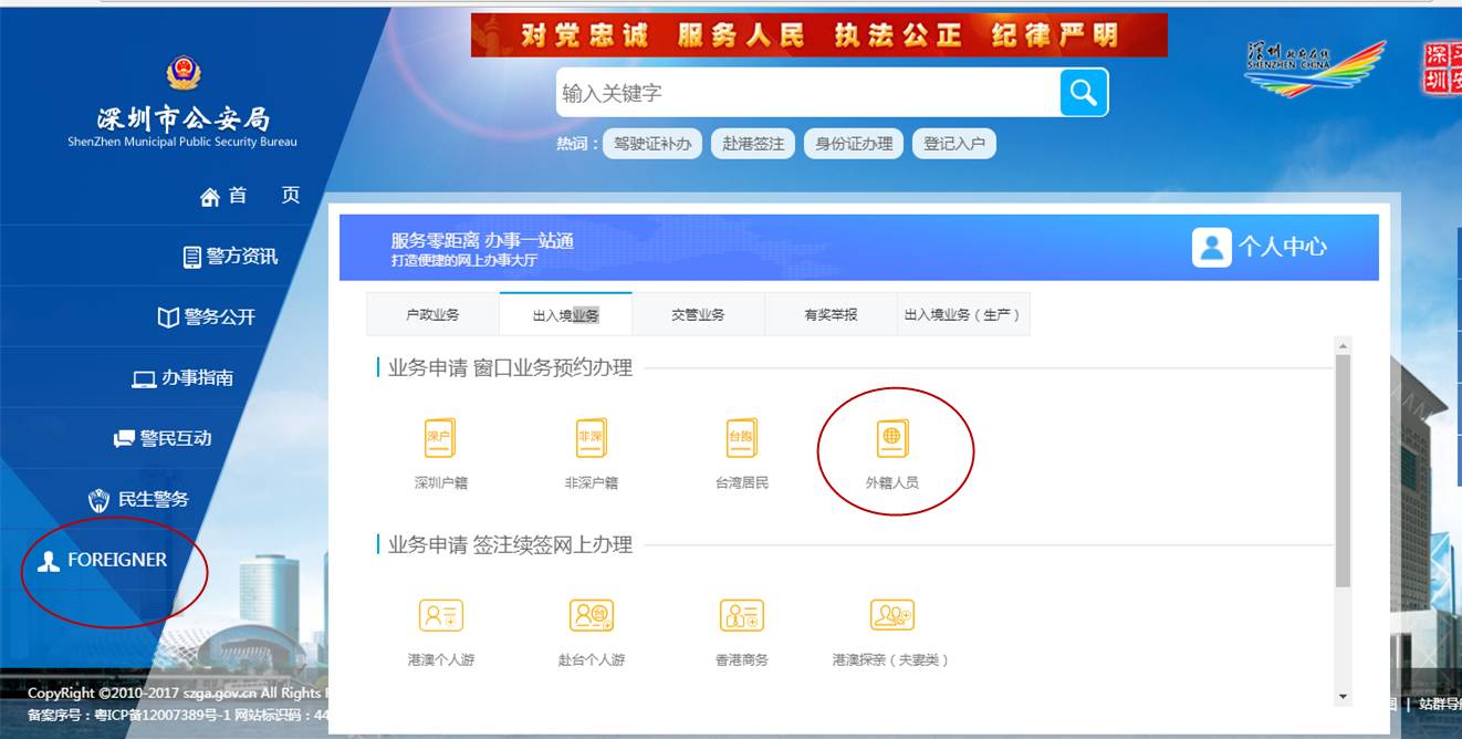 申请路径一:“深圳市公安局”主页/左侧“FOREIGNER”,选择您需要申请的业务。