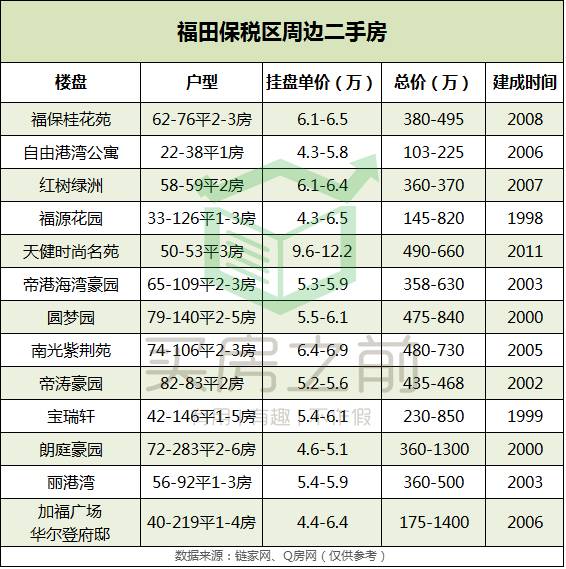 目前没有新房在售,二手房单价多在5-6万/平之间。相对于福田其他片区,保税区刚需户型算是性价较高的,总价400万左右还能买2-3房,而且基本都是2003年以后的楼盘,户型、结构都很好,电梯房为主,停车位也够用。