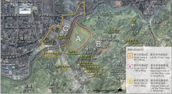(沿着深圳河,两岸分布着皇岗口岸、落马洲河套区域、福田保税区,形成“深圳河经济走廊”)