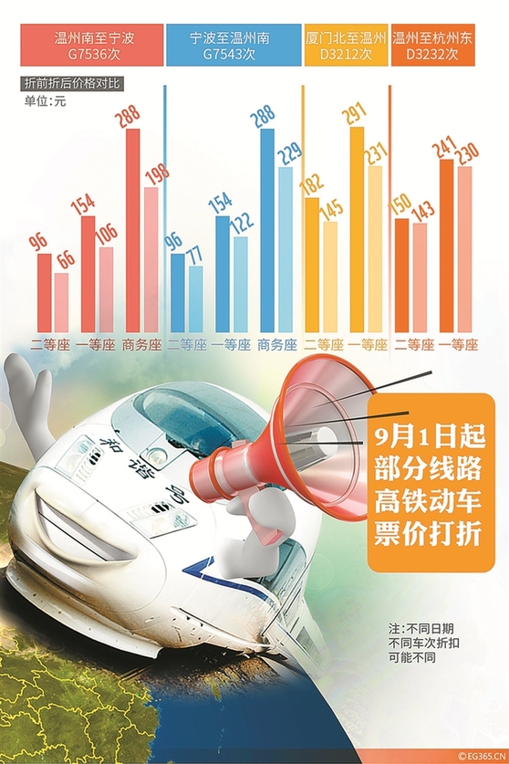 从宁波至温州南的高铁动车,部分车次将有一定的票价折扣。比如从9月1日起,每天8点56分从宁波发车的G7501次,二等座为92元,一等座147元,商务座275元,相当于打了9.5折;每天9点13分发车的G7543次,二等座为77元,一等座122元,商务座229元,相当于打了8折。