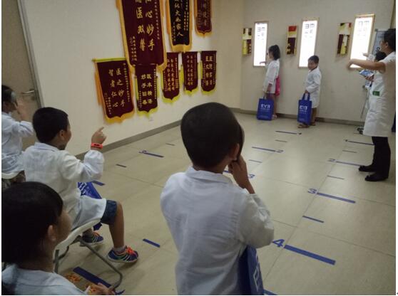 带着满怀期待的小朋友,我们来到了深圳市爱尔眼科医院,在社工们的维持下,激动的小朋友乖乖的排好队,等待检查视力以及眼睛验光,等待的过程中,热情的医师在旁解说:视力检查是检测你们的视力范围,而验光则是测眼球变形情况等专业内容。而后医师们带小朋友来到教室,开展了关于“如何爱眼护眼”为主题的讲座,看着小朋友认真专注的样子,医师们表示很欣慰。紧接着最有趣,最受小朋友期待的“小医生”体验活动终于到啦,小朋友们纷纷穿上小白大褂,成了一名活泼的小医生,小医生们来到视力检查区和验光区,轮流来当小医生,为搭档检查,并兴奋地说“哥哥,快来帮我拍照呀”最后医师教大家正确洗眼镜的方法并建议小朋友帮妈妈洗眼镜,于是“妈妈,我帮你洗眼镜”,“妈妈,眼镜给我一下”的声音此起彼伏。