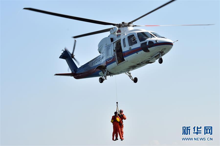 8月21日,参加海上救生训练的欧洲航天员萨曼莎·克里斯托弗雷蒂(左)在进行直升机悬吊营救训练。